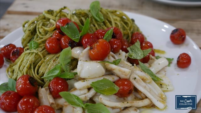 Basil Pesto Linguine, Squid and Scorched Tomatoes
